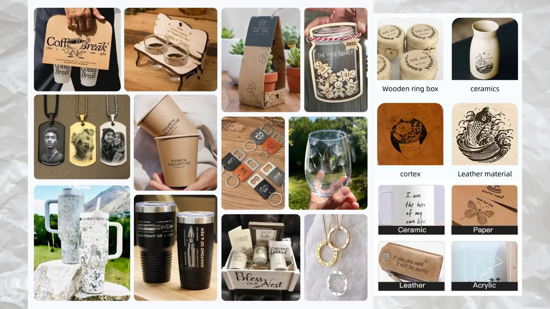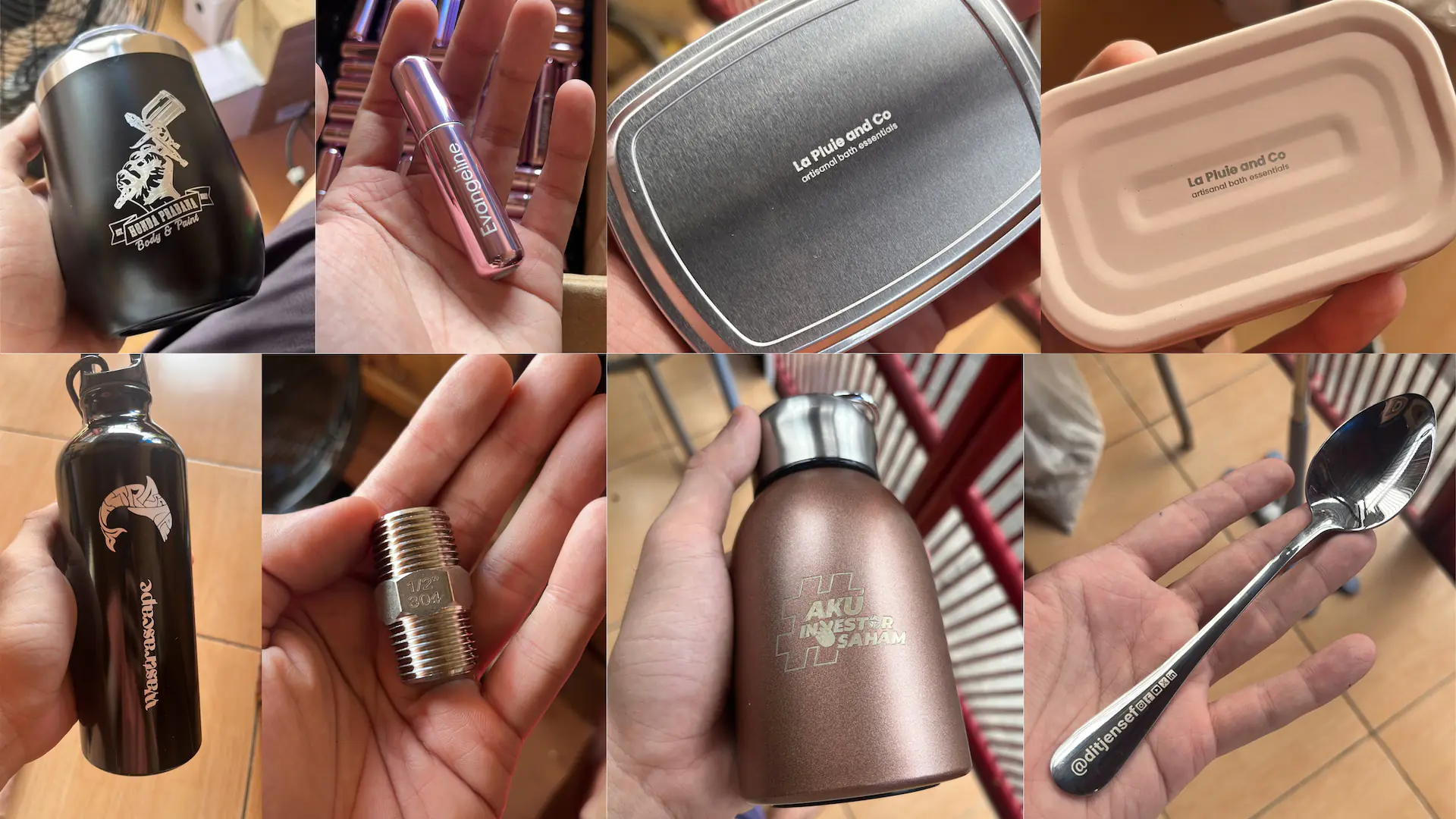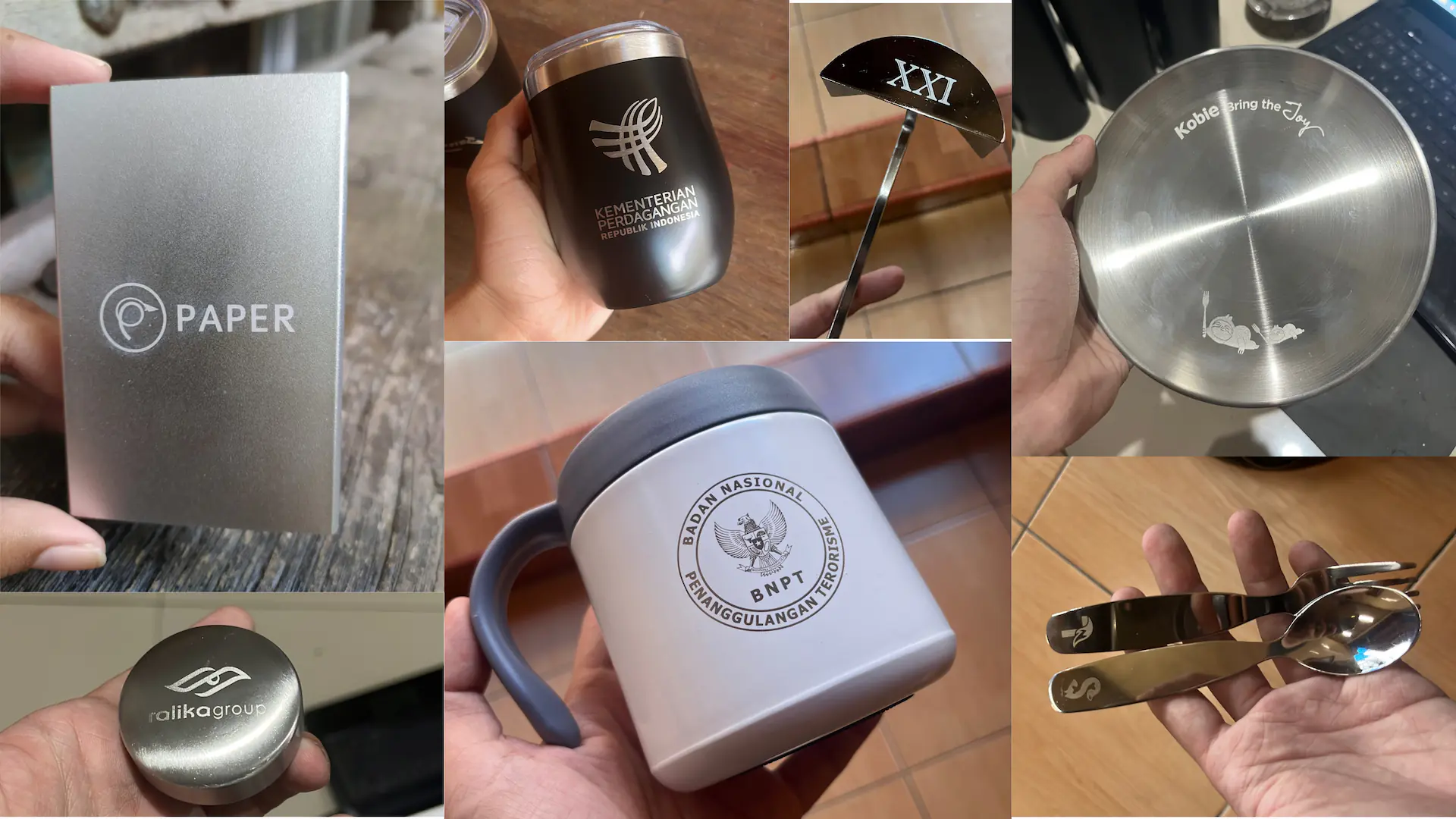 Kami melayani berbagai jenis material. Untuk Logam, kami menggunakan Fiber Laser yang efektif pada Stainless Steel, Aluminium, Kuningan, Tembaga, Besi, dan Titanium. Untuk Non-Logam, kami melayani Akrilik, Kayu, Kulit (Leather), dan Karet. Kami juga melayani Sablon khusus untuk media keras seperti Gelas Plastik, Paper Cup, Tumbler, dan Mug.